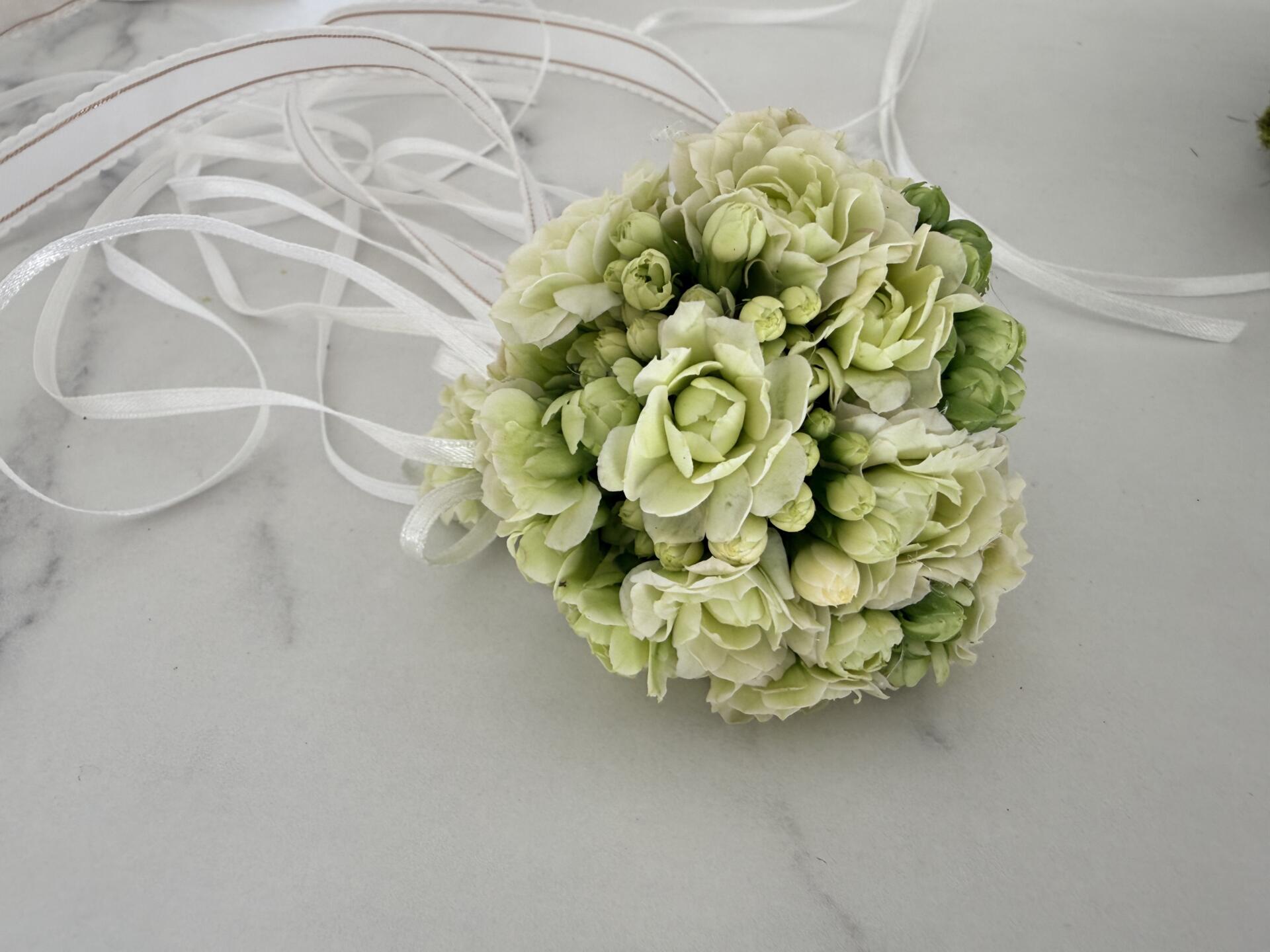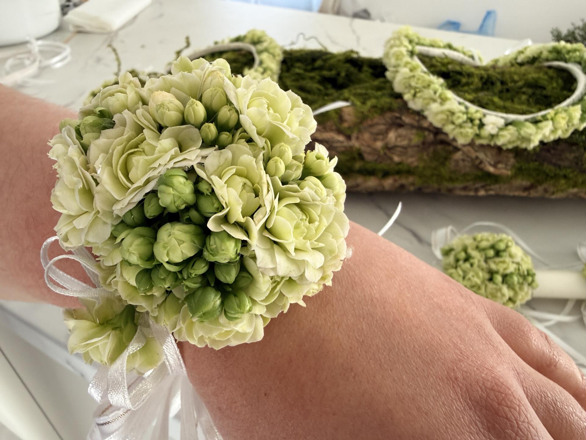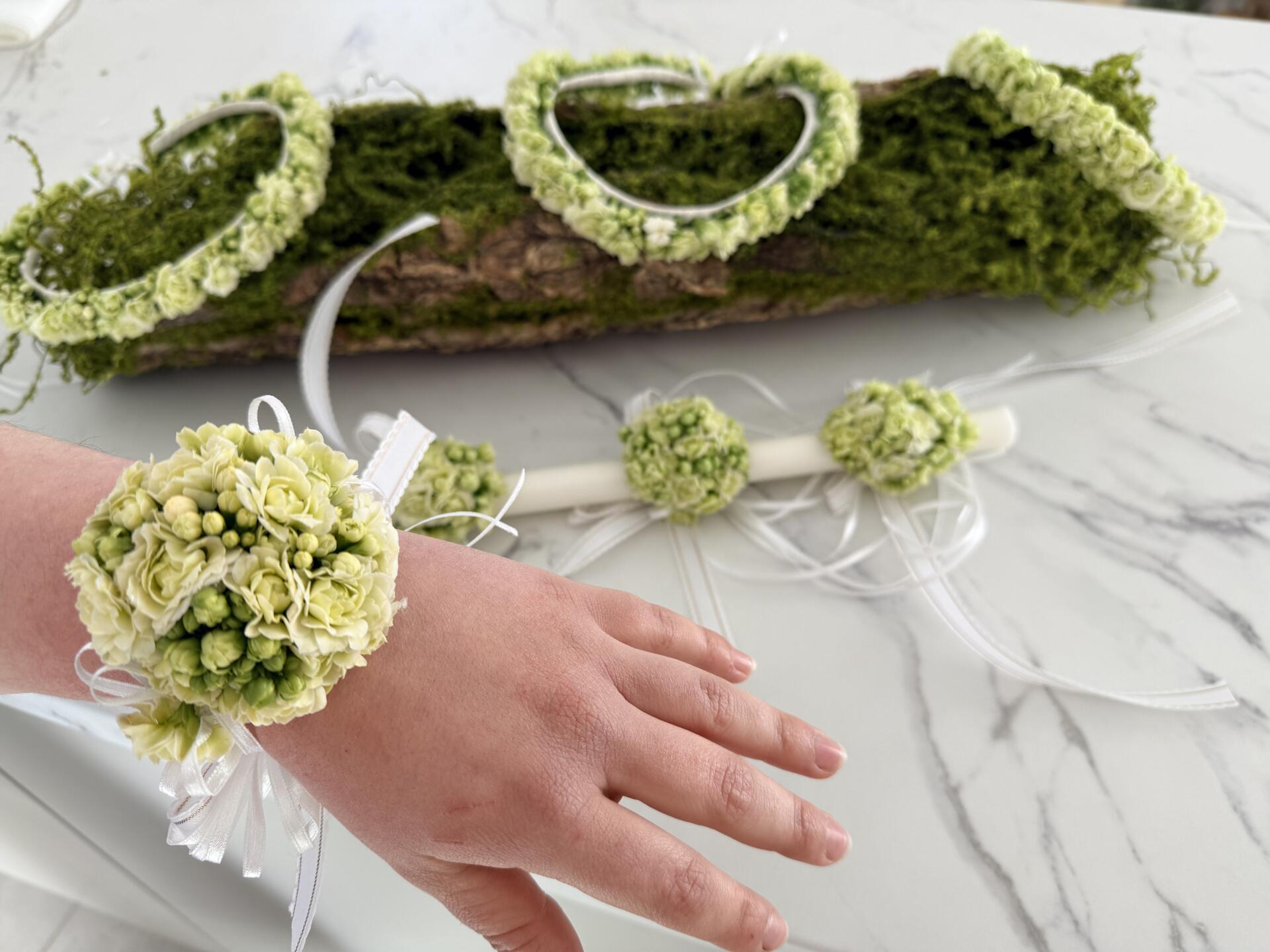 Delikatna bransoletka komunijna wykonana z kwiatów kalanchoe w świeżym, jasnym odcieniu zieleni. Lekka i subtelna forma pięknie uzupełnia wianek oraz dekorację świecy, tworząc spójny zestaw komunijny.
