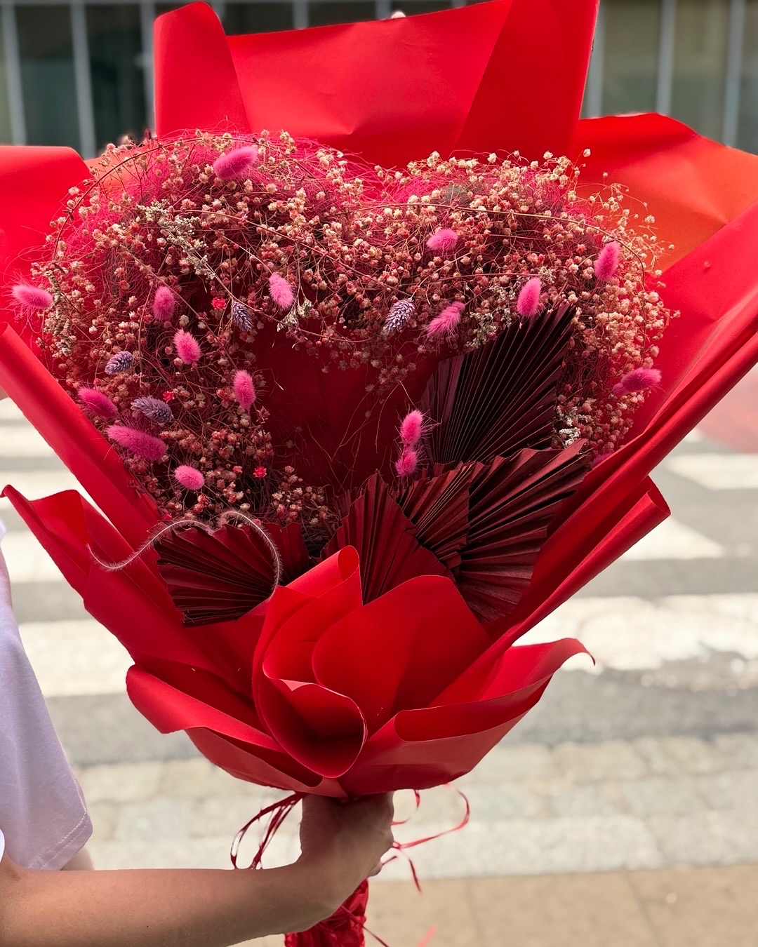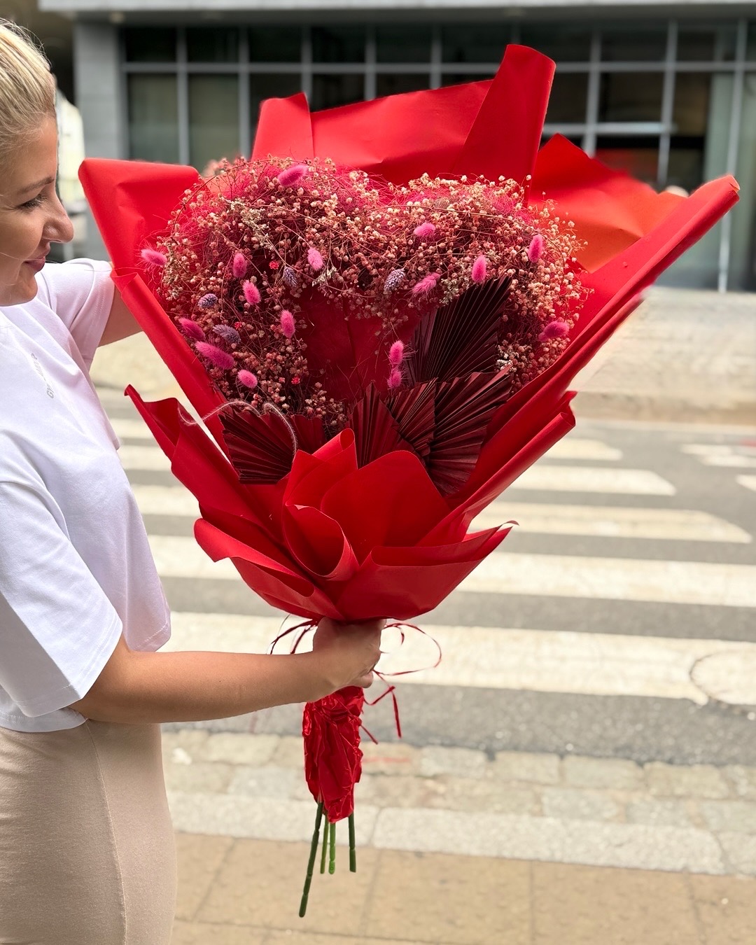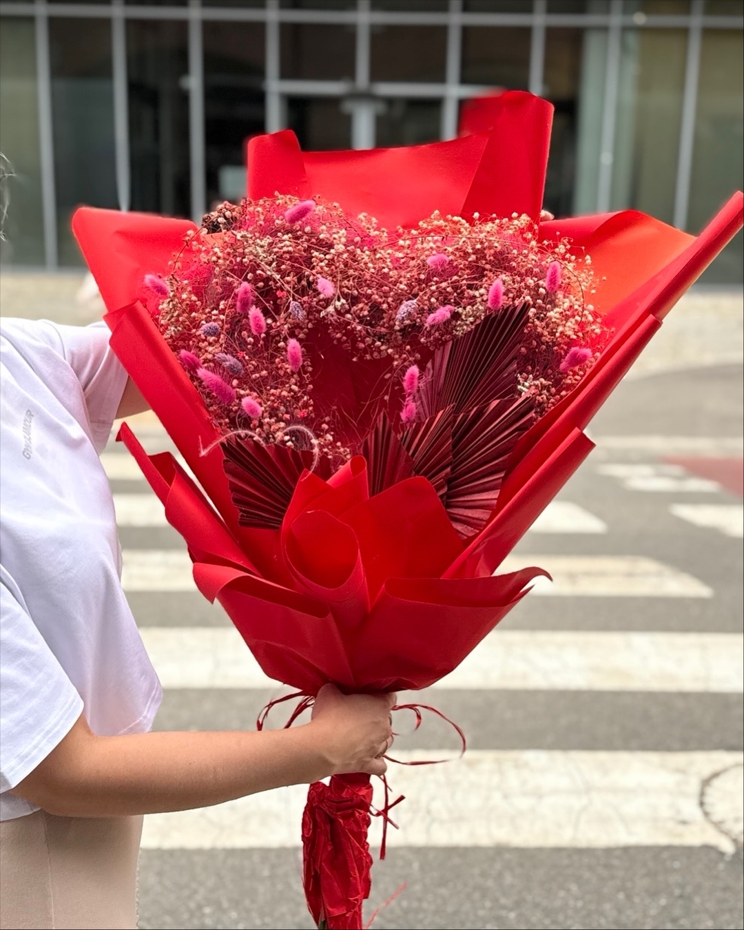 Bukiet został starannie ułożony z wysokiej jakości suszu, w tym gipsówki, dmuszku, drobnych traw dekoracyjnych oraz ozdobnych czerwonych wachlarzy z papieru, które nadają całości wyrafinowany, nowoczesny charakter. Całość otulona jest intensywnie czerwoną oprawą, podkreślającą emocjonalny wydźwięk bukietu.