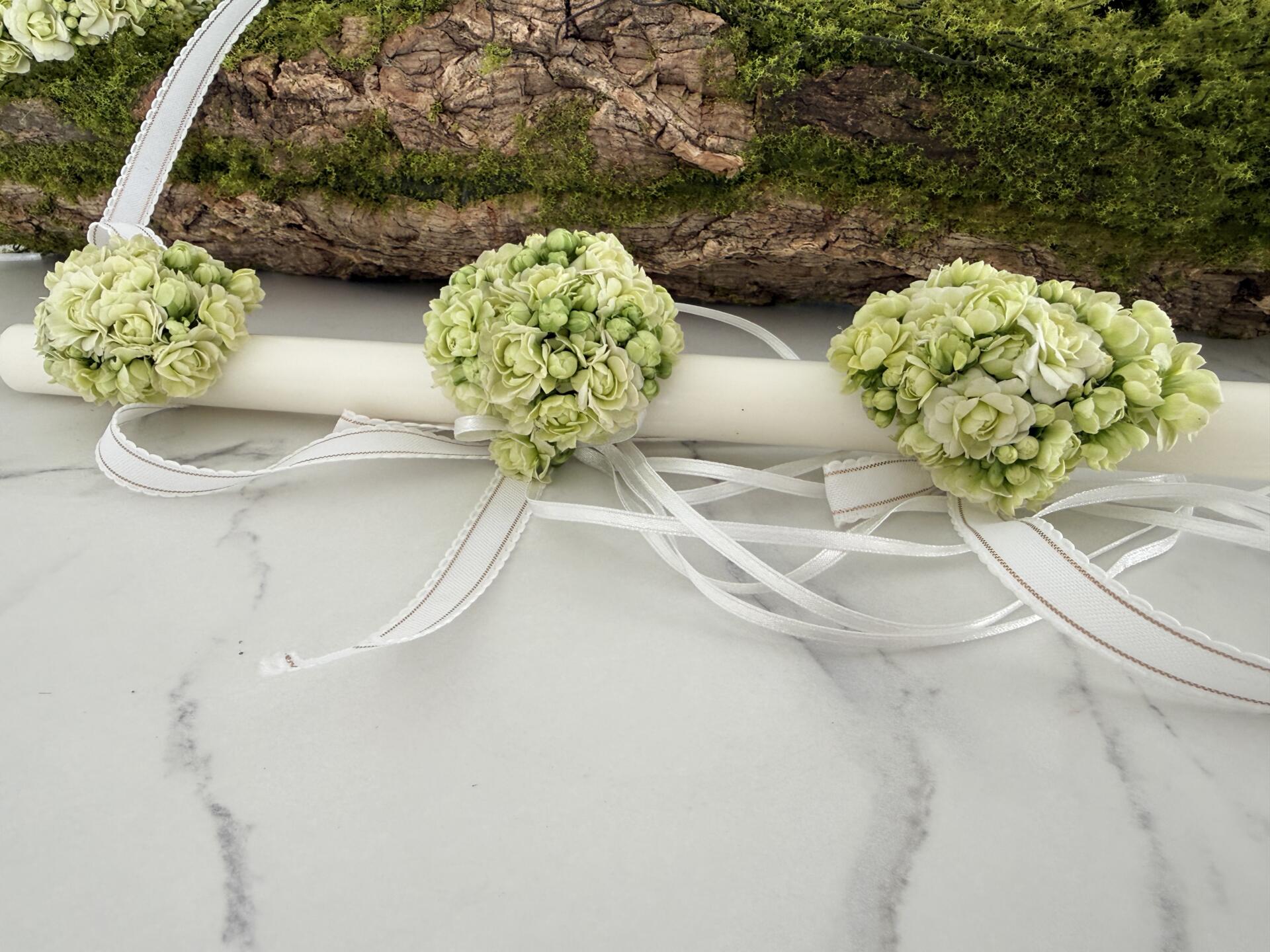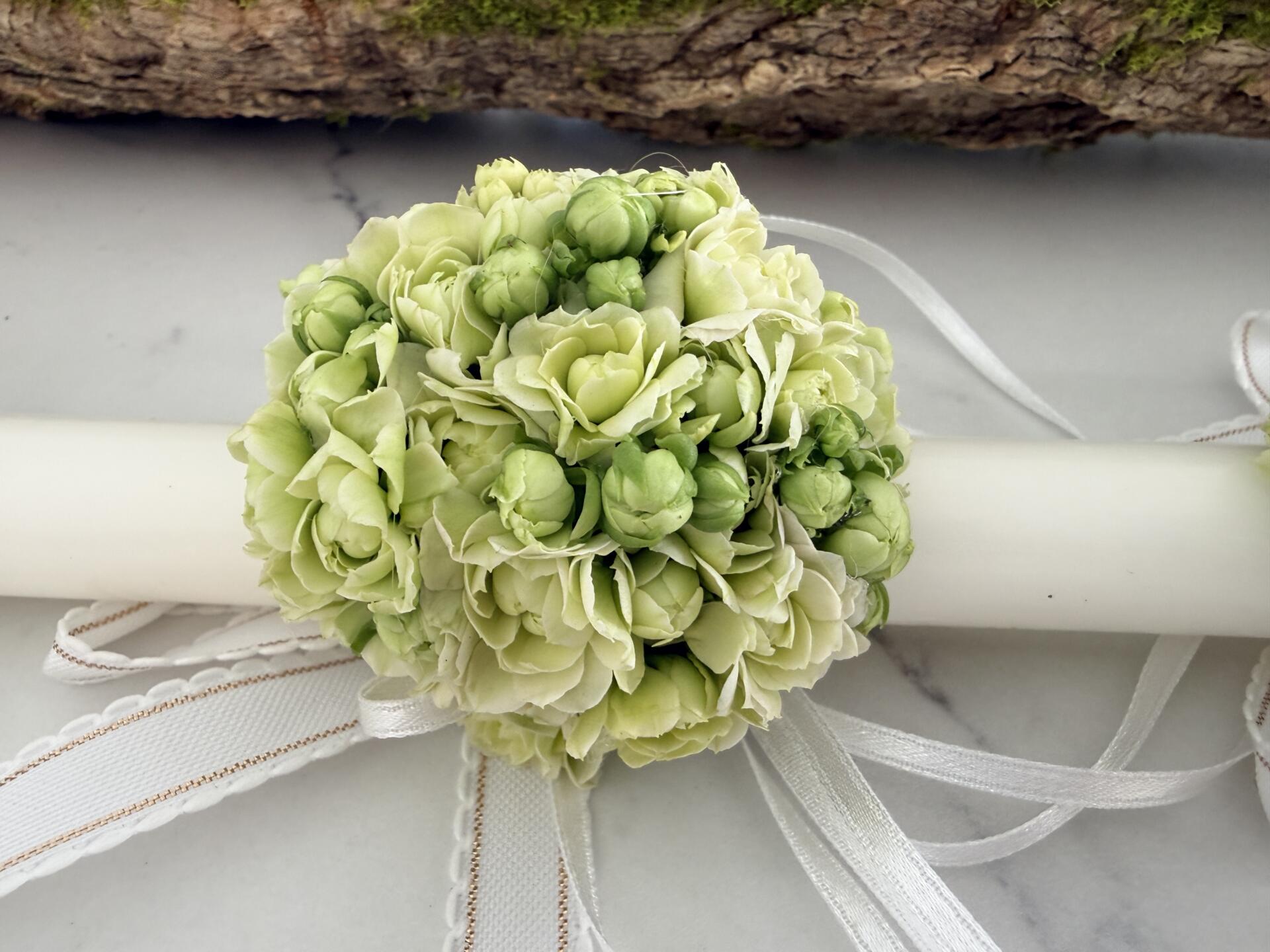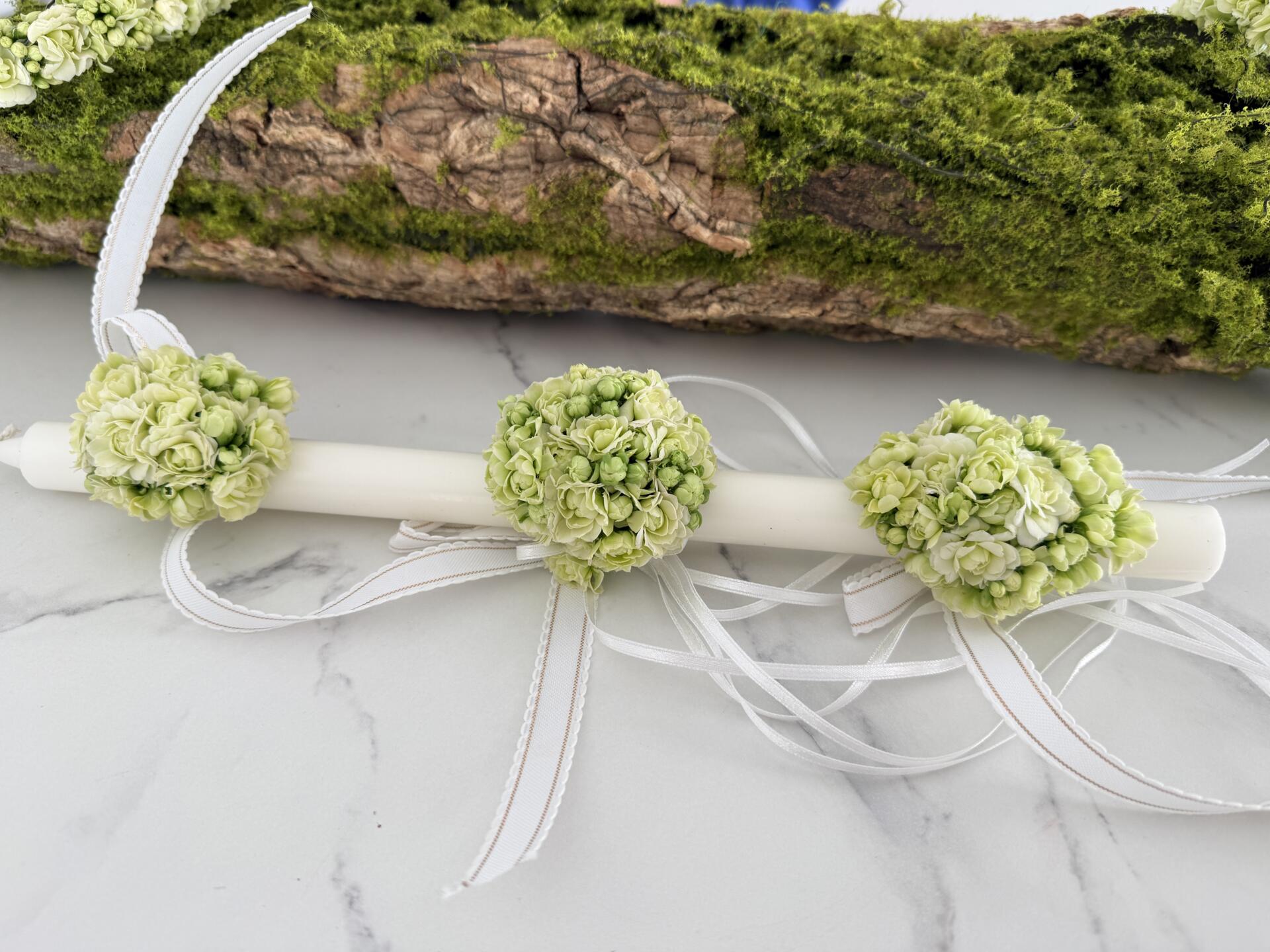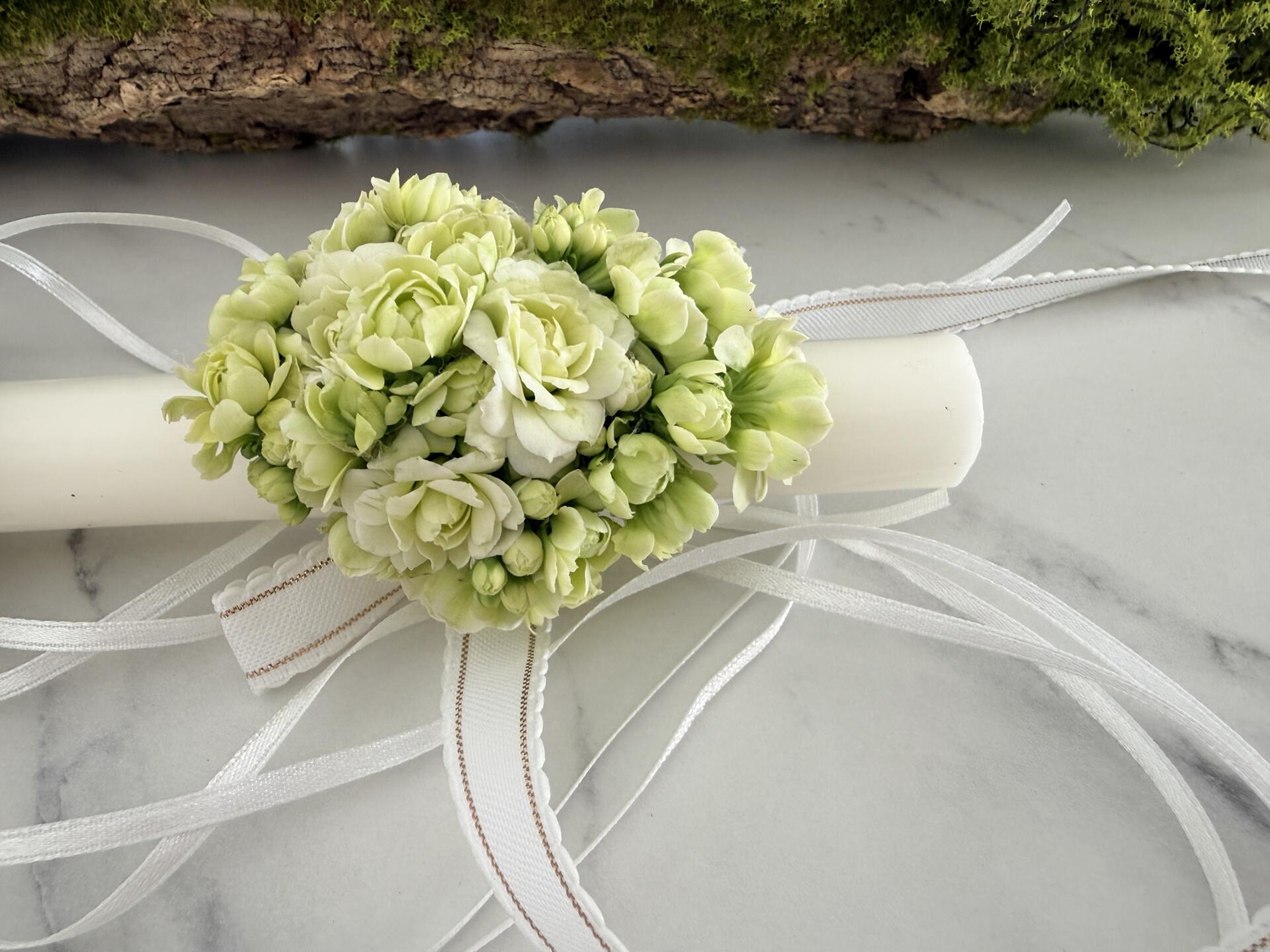 Delikatna dekoracja komunijna na świecę wykonana z kwiatów kalanchoe w świeżym, jasnym odcieniu zieleni. Naturalna forma subtelnie podkreśla charakter uroczystości i pięknie komponuje się z wiankiem oraz innymi dodatkami komunijnymi.