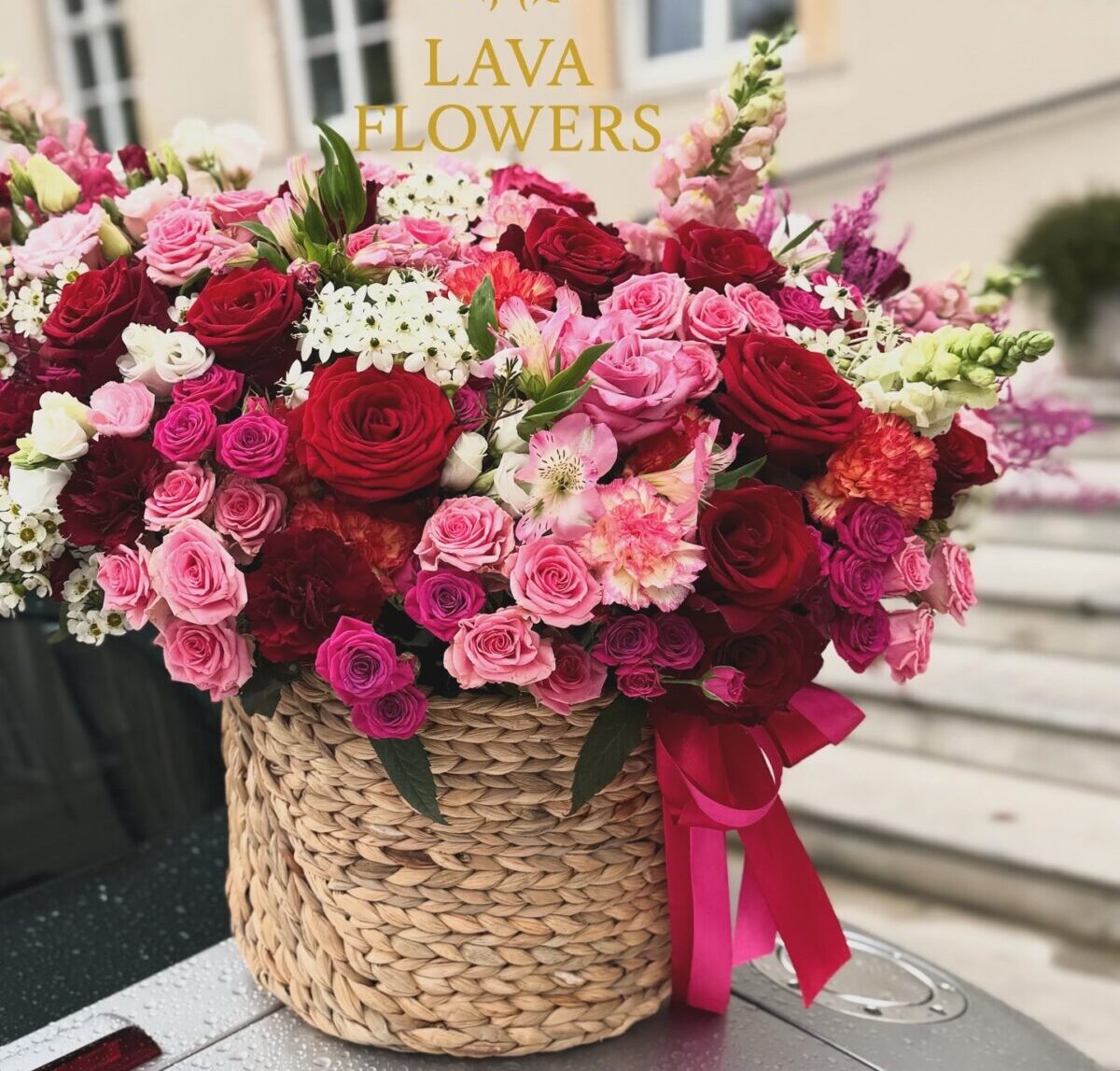 W koszu dominują pełne klasy róże w odcieniach głębokiej czerwieni i różu, romantyczne róże gałązkowe, delikatne alstremerie, lekkość gipsówki, subtelność eustom, a także kolorystyczne akcenty w formie goździków, astilbe i drobnych kwiatów sezonowych. Całość tworzy imponującą, bogatą paletę barw: soczystej czerwieni, fuksji, pudrowego różu, kremu i subtelnych przejść między nimi.