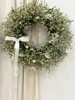 „Wiatr Północy” to artystyczny, ręcznie wykonany wianek z suszu i roślin stabilizowanych, stworzony z myślą o miłośnikach natury, spokoju i wyrafinowanego stylu. Kompozycja składa się z srebrzystego eukaliptusa, suszonej hortensji, dzikich traw, oraz wyrazistej żółtej craspedii, która wnosi energię i podkreśla wyjątkowy charakter dekoracji.